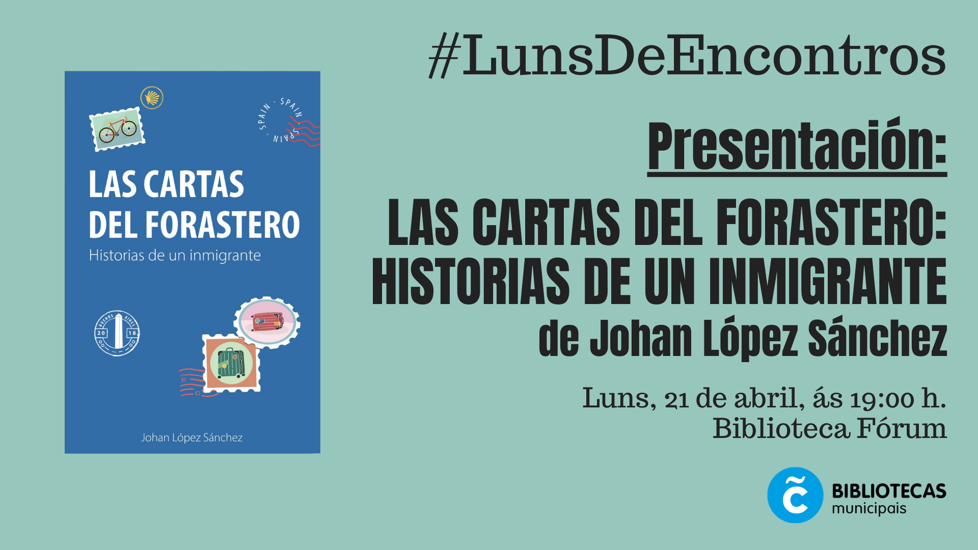 El lunes 21 de abril a las 19 h. en la Biblioteca Municipal Fórum Metropolitano tenemos la presentación del libro "Las Cartas del Forastero: Historias de un Inmigrante" de Johan López Sánchez.