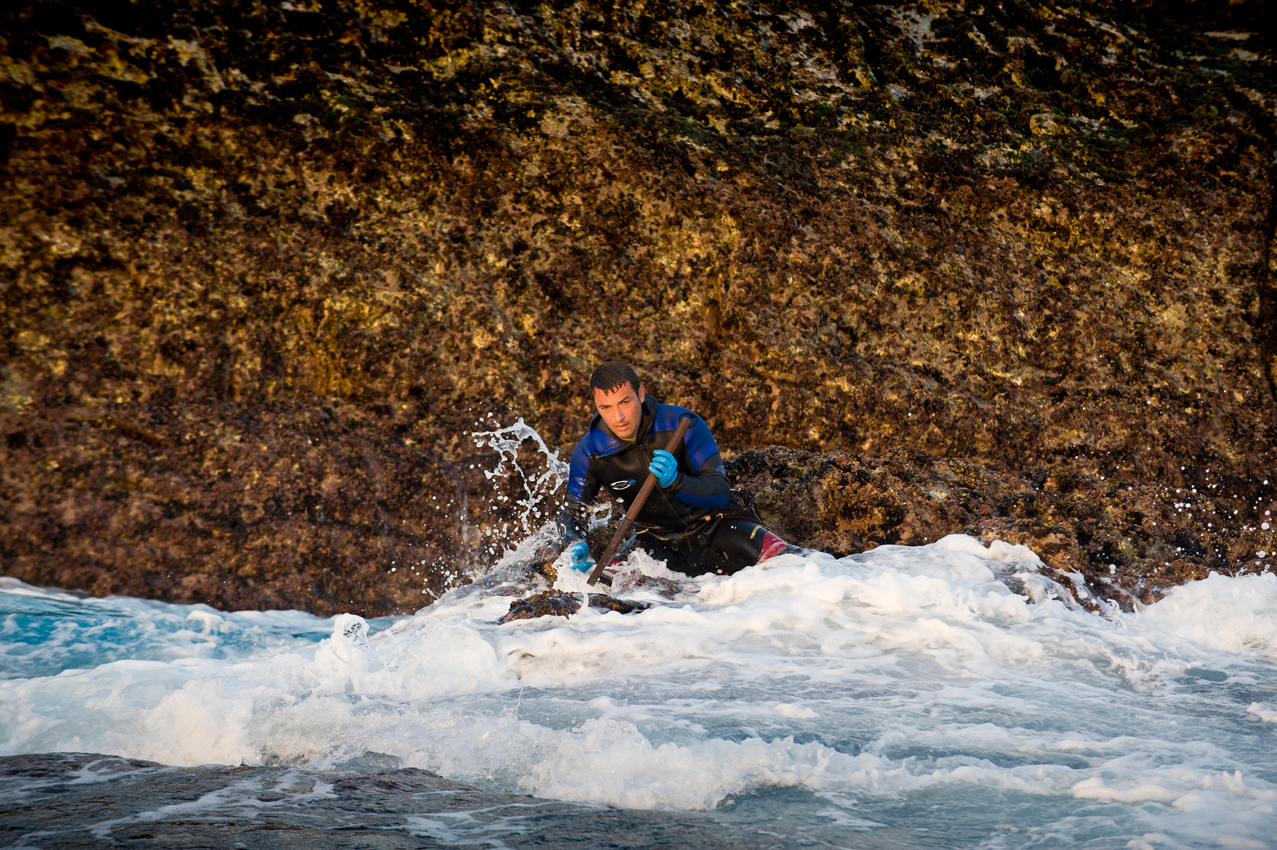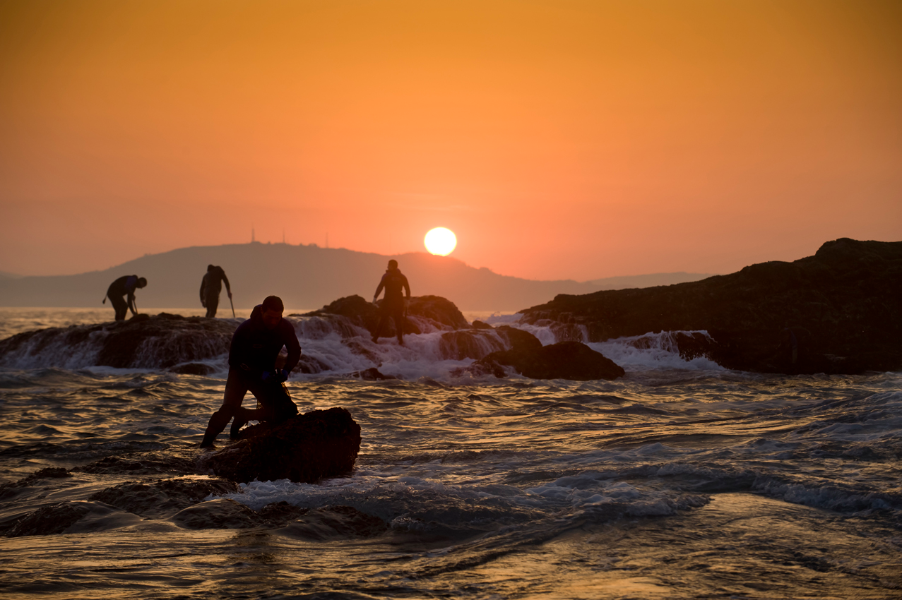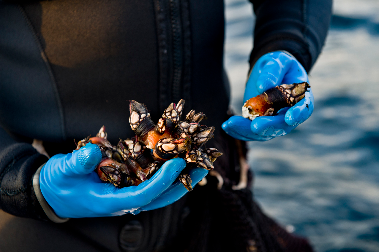 The goose barnacle is the king of shellfish, the most highly prized. That's because it is the most difficult to harvest. The goose barnacle gatherers go out every day in search of this shellfish, trying to dodge the waves and the raging of the Atlantic.