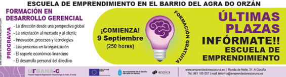 La Escuela de Emprendimiento en el barrio del Agra do Orzán forma parte del Proyecto URBANA C (Proyecto Integral de Regeneración Urbana de Agra do Orzán, A Coruña) puesto en marcha por el Ayuntamiento de A Coruña y cofinanciado en un 80% por el Fondo Europeo de Desarrollo Regional de la Unión Europea para proyectos de Desarrollo Local y Urbano.