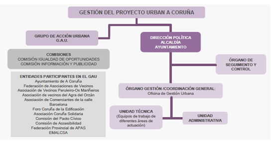 Este esforzo inicial vai ter a súa materialización e continuación ao longo de todo o ciclo de vida do proxecto. Por este motivo, para a execución do proxecto URBANA-C deseñouse un mecanismo de concertación e participación social de carácter permanente, o Grupo de Acción Urbana para garantir a correcta gobernanza durante a fase de execución.