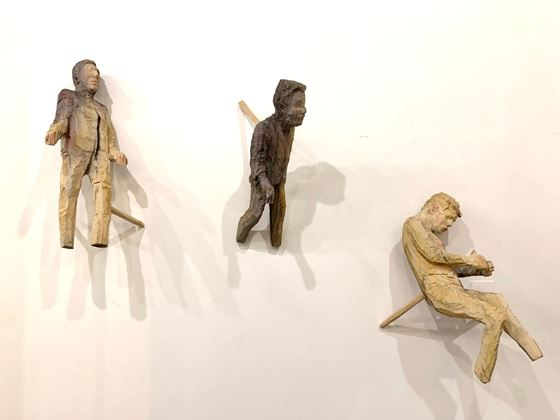 Casi cuatro años después de su última muestra individual en Moret Art, el escultor de Paradela regresa para mostrar "Ingrávidos". Se trata de un nuevo proyecto, del que asegura: "Intento sacar la mirada -que he de suponer cómplice de las leyes físicas- del confort visual y dispongo el volumen forzando ese punto de partida. Las obras se anclan sin asociar su descanso ni a la vertical ni a la horizontal. El espectador le devuelve su lógica pero antes ha de reubicarla por sí solo. No hay más objetivo que provocar la actividad necesaria para devolver las cosas a su sitio, proceso que podemos definir como ejercicio de profundidad". De este modo, nos encontramos con figuras humanas masculinas, todas ellas en posturas insólitas, que se asientan sobre el suelo o bien sobre la pared con la ayuda de cables metálicos, troncos o palos de madera, y que a simple vista producen extrañeza y desconcierto en el espectador. Una serie de personajes -algunos vestidos y otros sin ropa- se presentan aislados o agrupados en dos, y otro grupo se caracteriza por estar vinculado, siempre desde un plano individual, con troncos de vid, y portar traje y corbata. Son piezas realizadas con el material predilecto del artista, la madera, en esta ocasión de castaño, vid y eucalipto, y que en el plano estilístico se adscriben a la figuración expresionista tan característica de De la Vega, en la que se aprecian las huellas de las herramientas, cargadas de sentimiento y de inmediatez.
