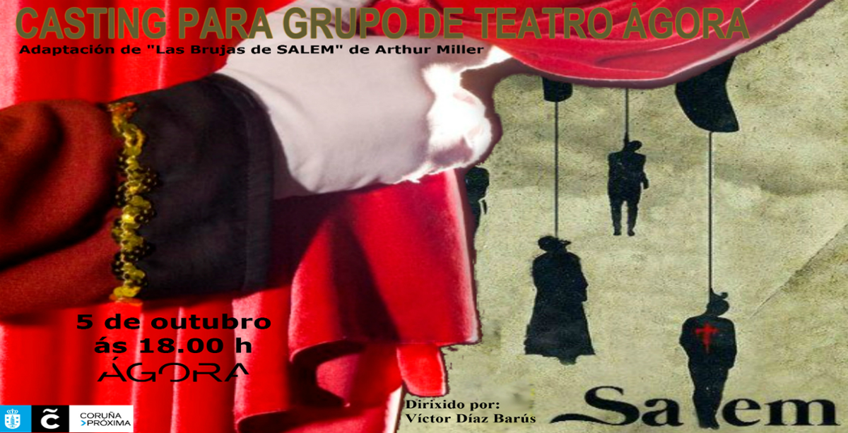 Se realizará un casting para el grupo de teatro del Centro Cultural Agora (Grupo teatro Agora) de la obra de teatro " SALEM" adaptación de "Las Brujas de SALEM de Miller" la obra trata de unos hechos reales acaecidos en la ciudad de SALEM (Estados Unidos) en el año 1692
