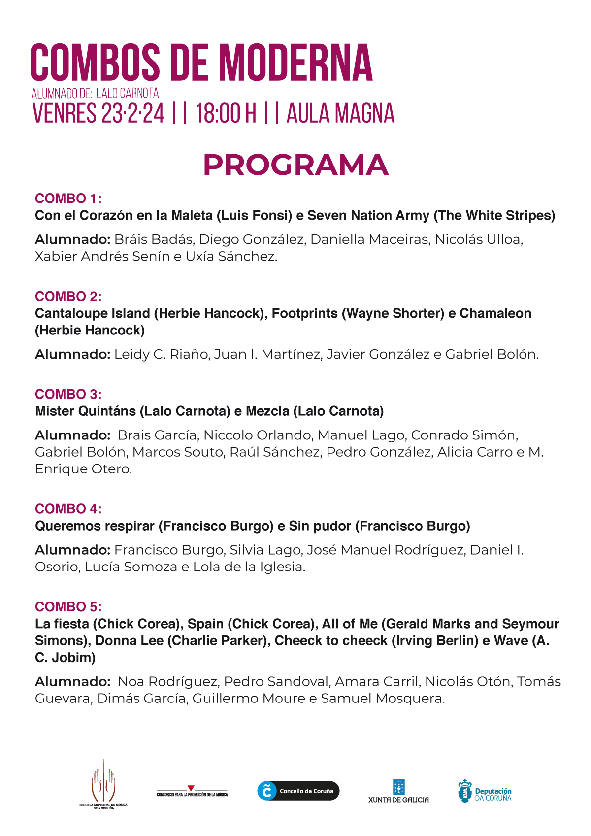El viernes 23 de febrero los alumnos de Combo de Moderna del profesor Lalo Carnota, darán un concierto en el Aula Magna a partir de las 18:00 horas.