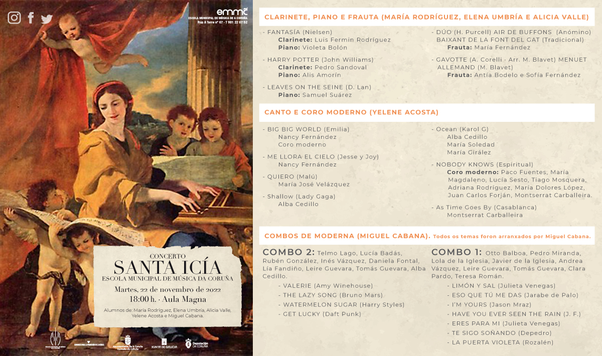El martes 22 de noviembre celebramos Santa Icía, Patrona de la Música. Por ese motivo, los alumnos de varias áreas de la Escuela darán un concierto.