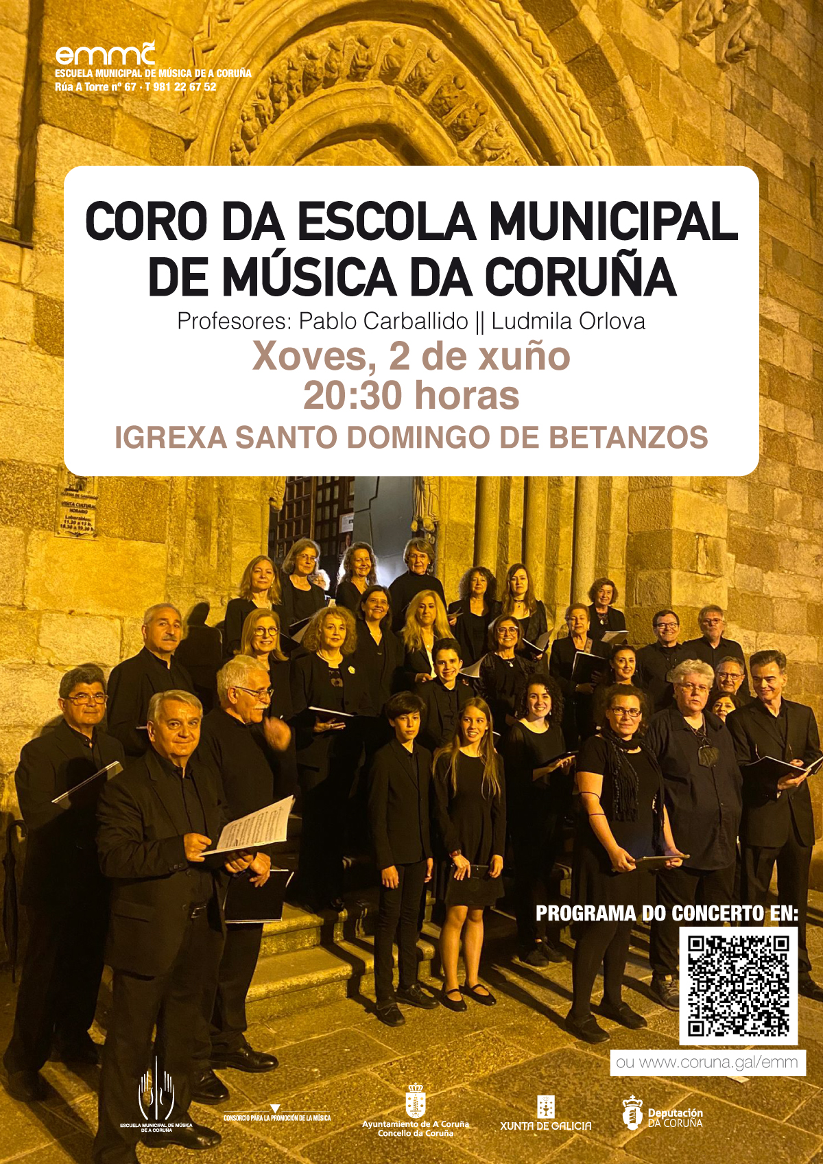 Este jueves 2 de junio los alumnos del Coro de la Escuela, de los profesores Pablo Carballido y Ludmila Orlova, darán un concierto en la Iglesia de Santo Domingo de Betanzos a partir de las 20:30 horas.