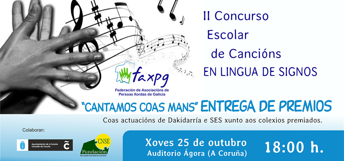 Se entregarán los galardones a los colegios premiados en este concurso, en el que han participado centros escolares de toda Galicia interpretando canciones en Lengua de Signos Española. Actuarán el grupo Dakidarría y la cantautora SES junto a los alumnos de los colegios galardonados, que les acompañarán en el escenario signando las canciones.