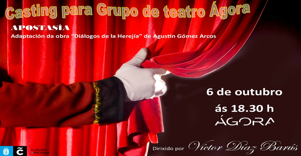 Se convoca un casting para seleccionar integrantes para un grupo de teatro a fin de representar la obra: APOSTASÍA: adaptación de la obra "Diálogos de la Herejía", de Agustín Gómez Arcos (dirigida por Víctor Díaz Barús).