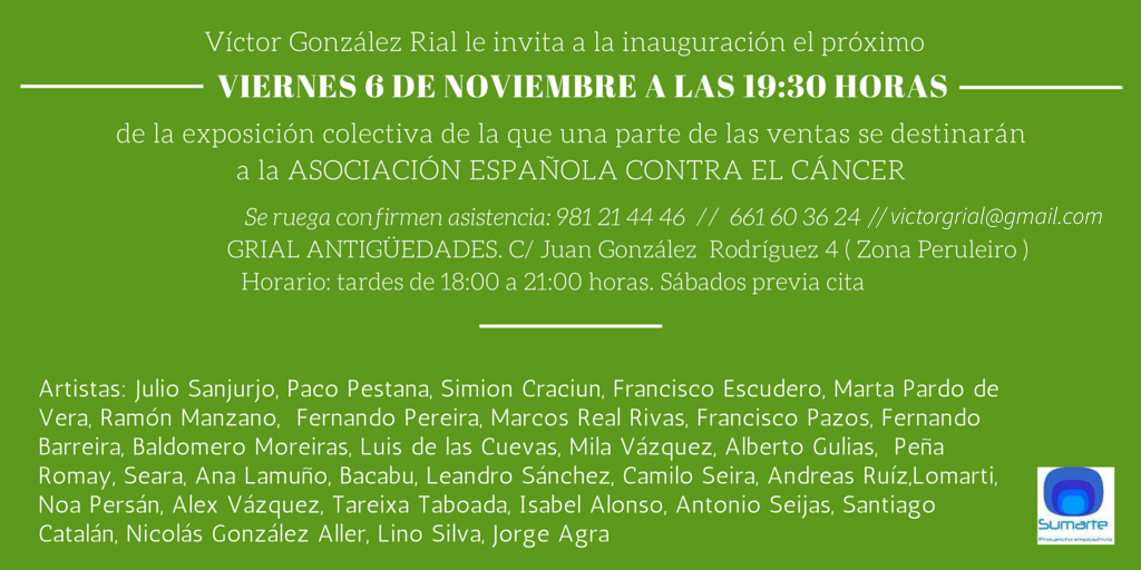 El 6 de noviembre a las 19:30 horas se inaugurará en Victor Rial Anticuarios, en A Coruña, una exposición con fines benéficos en la que un tanto por cien de las obras de estos artistas se donará a la Asociación Española contra el Cancer. Está exposición está coordinada por Cristina Carballedo.