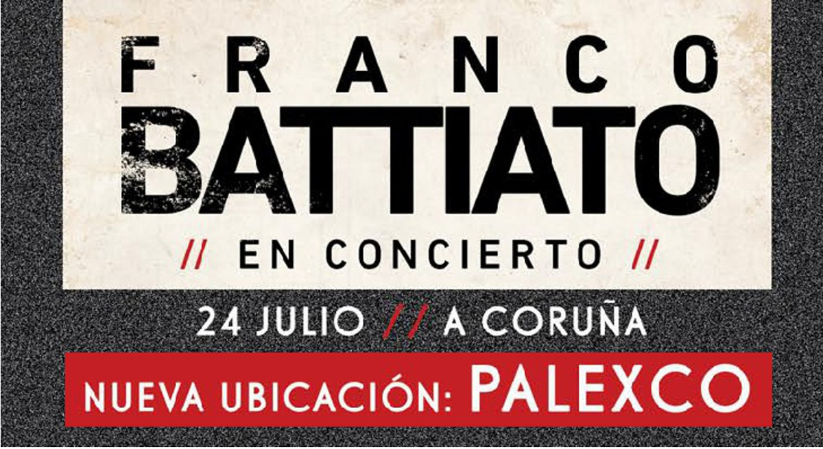 La organización del Concierto de Franco Battiato en A Coruña comunica que, debido a las obras de acondicionamiento del Palacio de la Ópera de A Coruña, se ha cambiado el lugar en el que se realizará el concierto que tendrá lugar el próximo lunes 24 de julio de 2017. El evento se celebrará en Palexco (Muelle de Transatlánticos, s/n, 15003, A Coruña). Los horarios del evento se mantienen sin cambios: • Apertura de puertas: 21:30 horas • Inicio del concierto: 22:00 horas Las entradas del Palacio da Ópera no tendrán validez, deben canjearse, en el mismo punto en el que se compraron, por entradas para Palexco