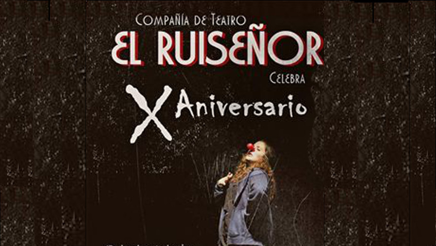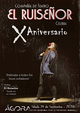En el cartel, Samantha Miguez, en su personaje en la obra 'RED'. Fue la primera alumna en entrar por la puerta del Ruiseñor, y hace unos meses se le pregunto cual era su frase favorita de todos los personajes que había hecho a lo largo de estos diez años. Con una sonrisa en la cara, su respuesta fue.......'Soy un payaso!' de la obra 'RED'.
