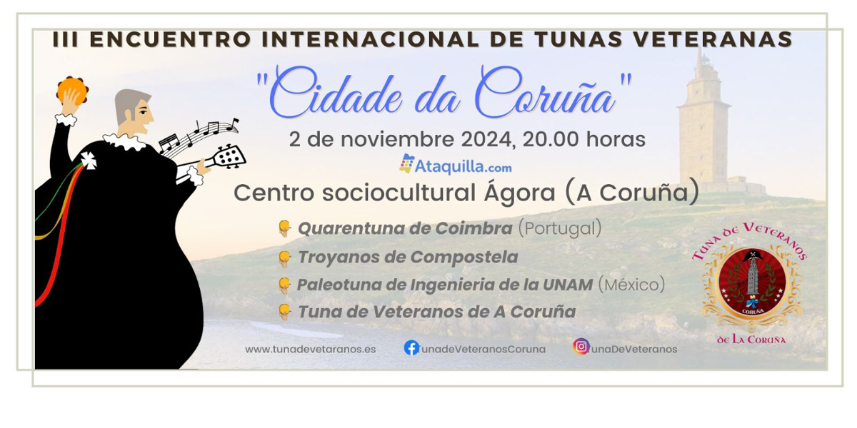 Dentro de los actos y conciertos programados para celebrar su 32º Aniversario, la Tuna de Veteranos de La Coruña ha organizado el III Encuentro Internacional de Tunas Veteranas "Cidade da Coruña", en el que contaremos con la participación de las siguientes Tunas: