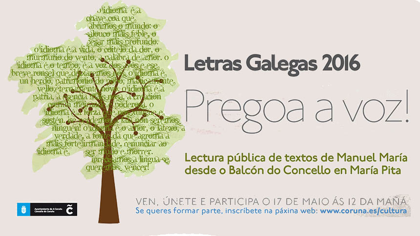 - María Pita - 17.05.2016 - 12.00 h: Pregoa a voz. Lectura pública de textos de Manuel María desde el balcón del ayuntamiento de María Pita.