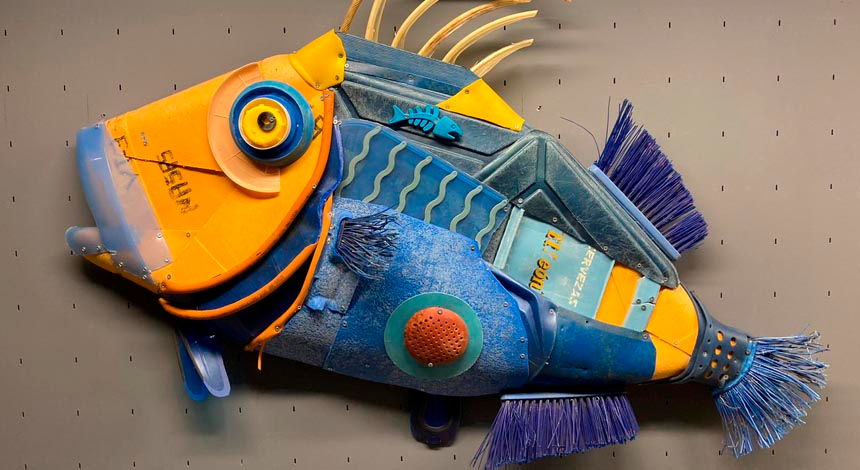 Las esculturas representan algunas de las especies marinas más comunes de nuestras costas, como un cabracho realizado con cepillos de dientes, restos de juguetes y palillos de batea; una merluza creada a partir de un neumático retorcido y la aleta de las ruedas de un Renault 6; un bonito que tiene como parte principal la tapa de un váter; un delfín confeccionado con dos sillines y la rueda de una bicicleta; una centolla cuyo caparazón es una tina de las que se usan en los barcos del palangre; un cormorán hecho con 513 pajitas; o un caballito de mar construido con 1.000 pinzas de ropa. Todos estos materiales, y todos con los que están construidas el resto de las piezas, fueron recogidos en las playas de Galicia.