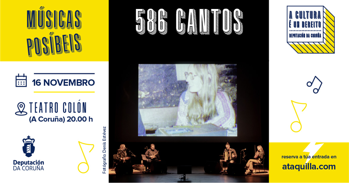 586 Cantos es un espectáculo audiovisual con música en directo producido por el Museo do Pobo Galego. Se trata de una idea original de la Muestra Internacional de Cine Etnográfico MICE Museo do Pobo Galego para poner en valor el papel de la poesía popular oral y de las cantareiras, que protagonizarán el Día de las Letras Gallegas 2025, y para valorizar los archivos que albergan el patrimonio inmaterial gallego. La pieza toma como punto de partida el Cancionero Popular Gallego, fruto del trabajo de investigación de Dorothé Schubarth con la colaboración de Antón Santamarina. Las fotografías, las grabaciones sonoras originales, las partituras y otros materiales recopilados por Schubarth en sus investigaciones, custodiadas en el Museo do Pobo Galego, son el punto de partida de una puesta en escena que combina el montaje audiovisual realizado por Laura Piñeiro y Fran Rodríguez Casal, cineastas de la Asociación Memoria y Cine, con la música en directo de Richi Casás, Fran Barcia, Tania Caamaño y Antía Ameixeiras.