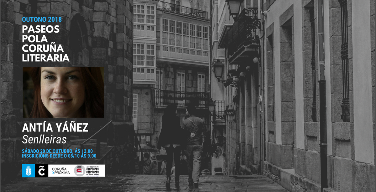 Antía Yáñez fará un percorrido pola Coruña dos anos 30 e as súas singularidaes que ambienta a novela Senlleiras. A autora amosaranos os principais escenarios desta novela, recente gañadora do II Premio Illa Nova: os edificios modernistas, a antiga sede de A Nosa Terra, a localización dos hoteis desaparecidos...