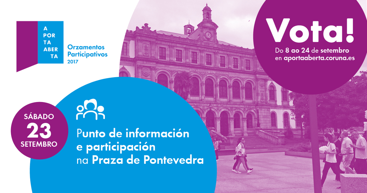 Para facilitar la participación en la fase de votación de los Presupuestos Participativos, el Ayuntamiento se habilitan dos puntos de información y participación en la calle en los que se podrán consultar las propuestas y votar a través de dispositivos móviles: el sábado 16 de septiembre en el Obelisco y el sábado 23 en la Plaza de Pontevedra (ambos en horario de 16:00 a 21:00). Estos puntos contarán con áreas de descanso y juego.