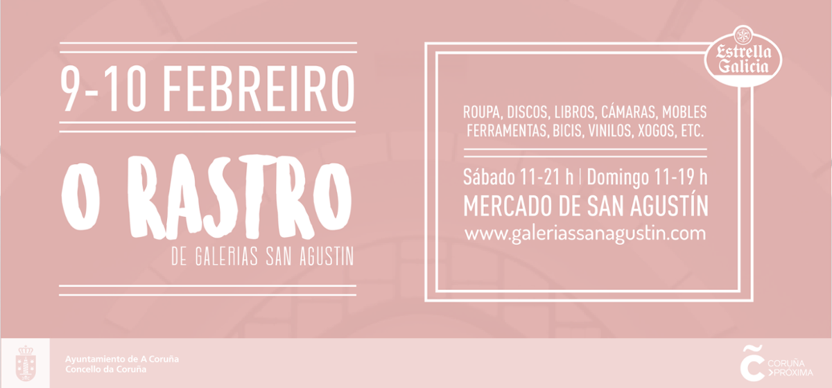 O mercado de San Agustín convértese nun gran rastro onde calquera cousa que xa non uses adquire un novo valor. Roupa, mobles, discos, videoconsolas, libros, selos, bicicletas, ferramentas, xogos o todos aqueles tesouros que xa non teñan cabida no teu fogar, téñena nas Galerías de San Agustín.