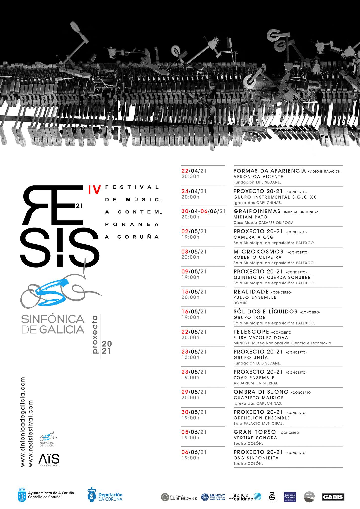 RESIS es un festival internacional de música contemporánea y artes vivas que establece en A Coruña un punto de encuentro para la difusión de la creación e interpretación de nuestro tiempo. Un espacio de confluencia donde generar nuevas vías de escucha, reflexión, debate y formación sobre los distintos lenguajes de la creación de vanguardia.