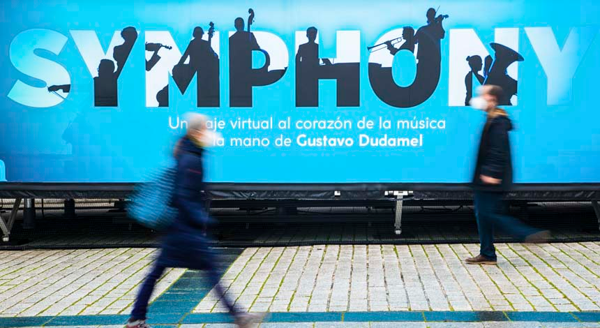 SYMPHONY está formada por dos unidades móbiles, desplegables, que se convierten en dos salas de cien metros cadrados cada una. En estas estancias, el público podrá gozar de una experiencia inmersiva en dos tiempos, con una duración aproximada de cuarenta minutos. La experiencia comienza con laa proyección de una película panorámica y sigue con un salto a la realidad virtual que permite un visionado en 360º de la Mahler Chamber Orchestra, dirigida por el maestro venezolano Gustavo Dudamel, grabada en el Gran Teatro Liceo de Barcelona.