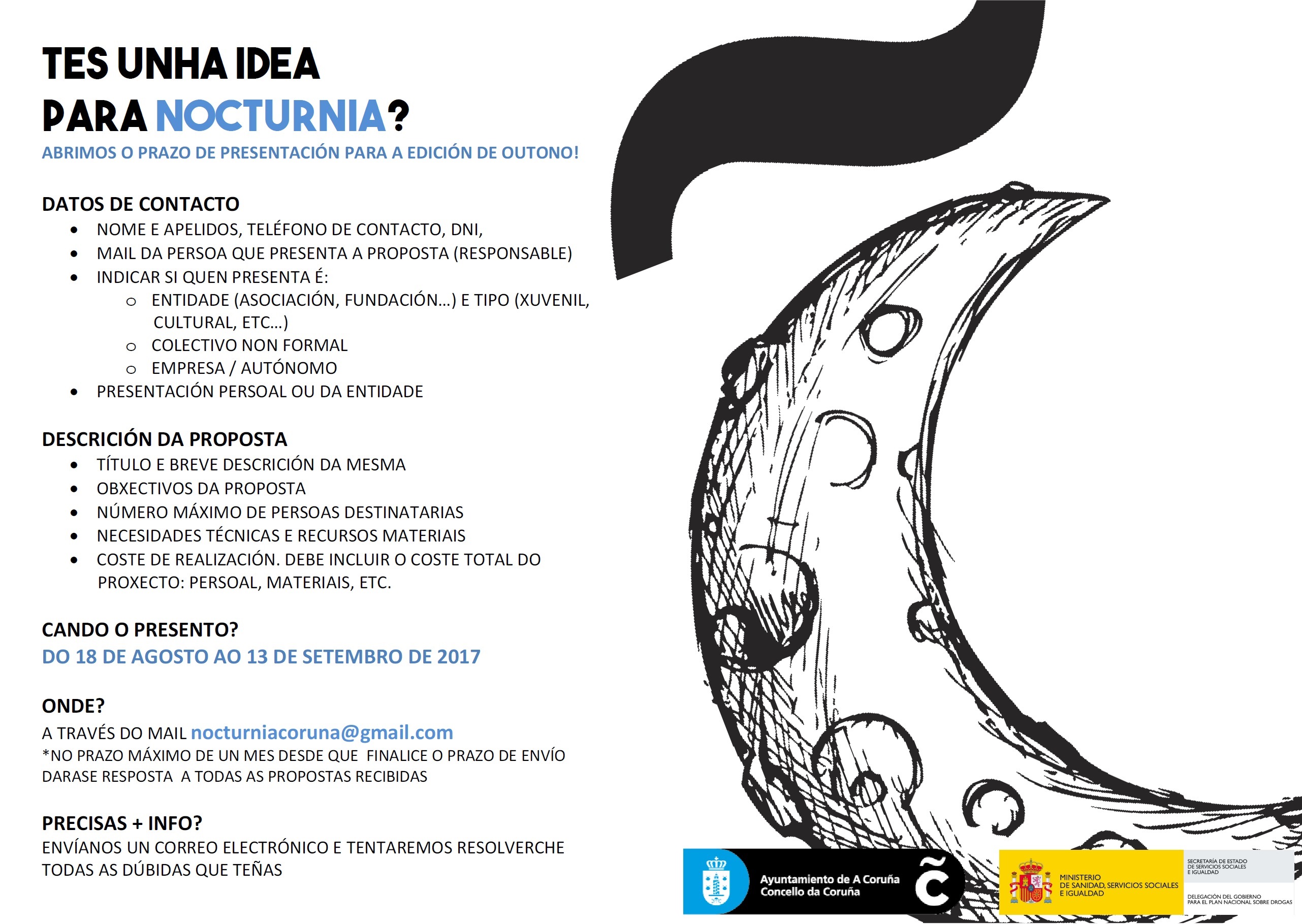 Del 18 de agosto al 13 de septiembre del 2017 se abre un nuevo periodo en el que asociaciones, colectivos informales, entidades y público en general podrán enviar proyectos y propuestas a través del mail nocturniacoruna@gmail.com , para que participen en la elaboración y diseño del programa de primaveira, generando así un proyecto global de participación juvenil.
