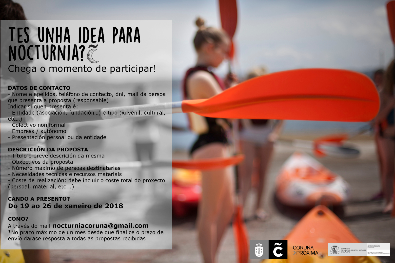 Del 19 al 26 de enero del 2018 se abre un nuevo periodo en el que asociaciones, colectivos informales, entidades y público en general podrán enviar proyectos y propuestas a través del mail nocturniacoruna@gmail.com , para que participen en la elaboración y diseño del programa de primavera, generando así un proyecto global de participación juvenil.