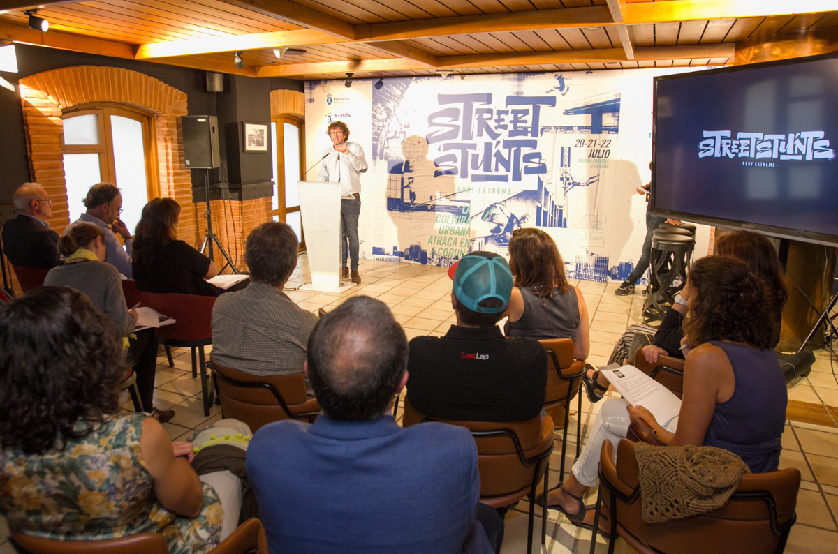 A Coruña acogerá entre el 20 y el 22 de julio, por primera vez en la ciudad, el festival de cultura urbana multidisciplinar Street Stunts Body Extremy. El concejal de Culturas, Deporte e Coñecemento, José Manuel Sande, y la gerenta del Consorcio de Turismo, Lanzada Calatayud, participaron esta mañana en la presentación de la iniciativa, que se celebrará en el Paseo del Parrote este fin de semana y cuyas instalaciones y estructuras para la práctica de parkour, street workout o psicoblock ocuparán más de 30.000 metros cuadrados. El evento, en el que participarán más de 500 deportistas, ofrecerá distintas competiciones deportivas, talleres, exhibiciones y conciertos abiertos a la ciudadanía.