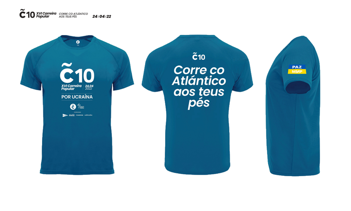 La camiseta de Coruña10 porta un mensaje de paz en la manga izquierda, con los colores de la bandera de Ucrania, y en el anverso, la leyenda "Por Ucraína", que acompaña el logo de la prueba, la C10, su edición de este año, la decimosexta, y la fecha en la que se celebra, 24 de abril, así como la mención a los organizadores, el Concello de A Coruña y la Federación Galega de Atletismo, y los patrocinadores: El Corte Inglés, Coca-Cola y Horno Sanbrandan.