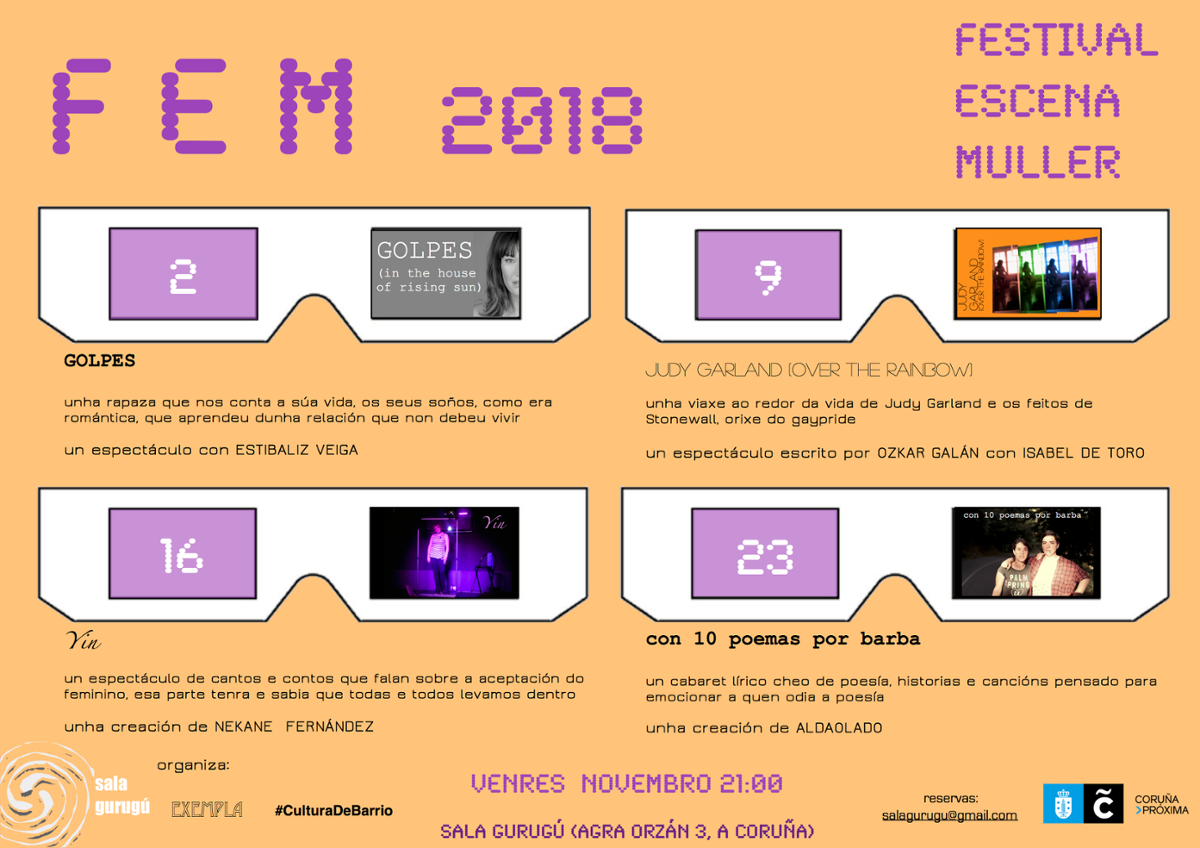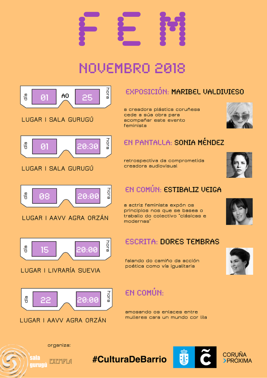 A vindeira cita do FEM 2018 será con Dores Tembrás, na libraría Suevia, o xoves 15 de novembro, ás 20.00 horas. A sesión permitirá dar a coñecer a postura creativa da escritora, quen presentará o seu traballo e as razóns das súas decisións creativas. O venres 16 será a quenda de YIN, un espectáculo de Nekane Fernández de cantos e contos que abordan a aceptación do feminino. A cita, como é habitual, será ás 21.00 horas na sala Gurugú. Finalmente, o festival pecharase o xoves 22, ás 20.00 horas, coa charla Muller e sociedade na sede da asociación veciñal da Agra do Orzán, e o concerto-espectáculo Con 10 poemas por barba de Aldaolado. O recital do dúo conformado por Lucía Aldao e María Lado terá lugar na Gurugú, o día 23, ás 21.00 horas.