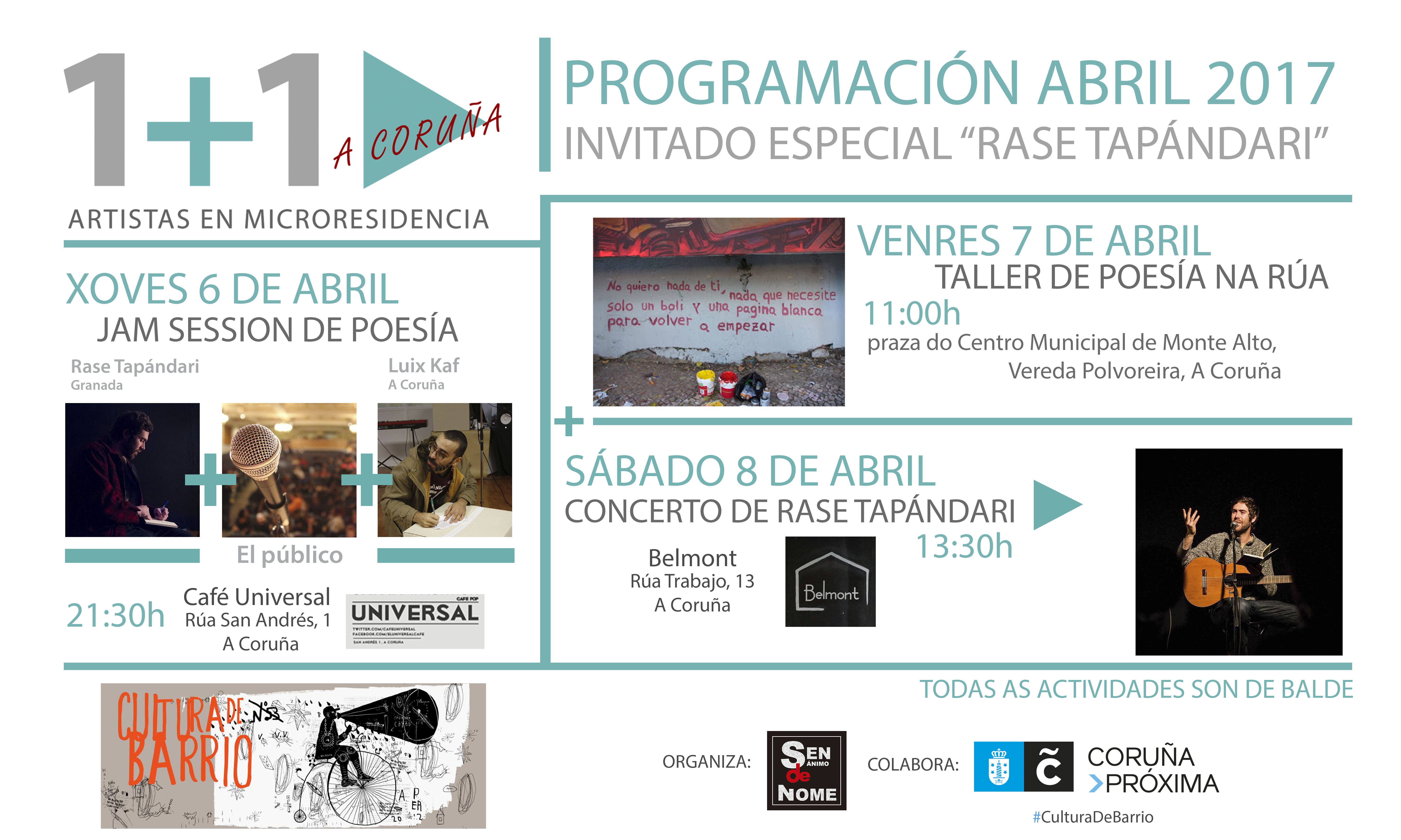 De este modo, la programación del proyecto Artistas en microresidencia que tendrá lugar ese fin de semana en distintos espacios de la ciudad, contará con la participación del polifacético artista granadino Rase Tapándari --que desarrolla su trabajo a través de disciplinas como slam poetry o el rap--, y el poeta coruñés Luix Kaf, miembro de la banda The Fulans. Así, este jueves, 6 de abril, a las 21.30 horas horas, Sen Ánimo de Nome organiza una jam session de poesía, un recital abierto a la participación del público en el que participarán tanto Tapándari como Kaf. Al día siguiente, el viernes 7, el Centro Cívico de Monte Alto acogerá, a las 11.00 horas, un taller de poesía en la calle impartido por los dos poetas, que finalizará con una intervención artística en un mural y, finalmente, el sábado 8, el granadino ofrecerá a las 13.30 horas, en el mismo barrio, un concierto acústico en el que mezclará música y slam poetry.