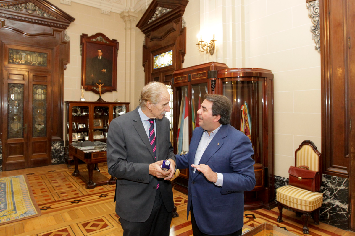 Carmelo Angulo Barturen firmó en el libro de oro de la ciudad y recibió, por parte del alcalde, una Torre de Hércules dedicada y un libro sobre el monumento coruñés, Patrimonio de la Humanidad, como recuerdo de su visita al Palacio Municipal.