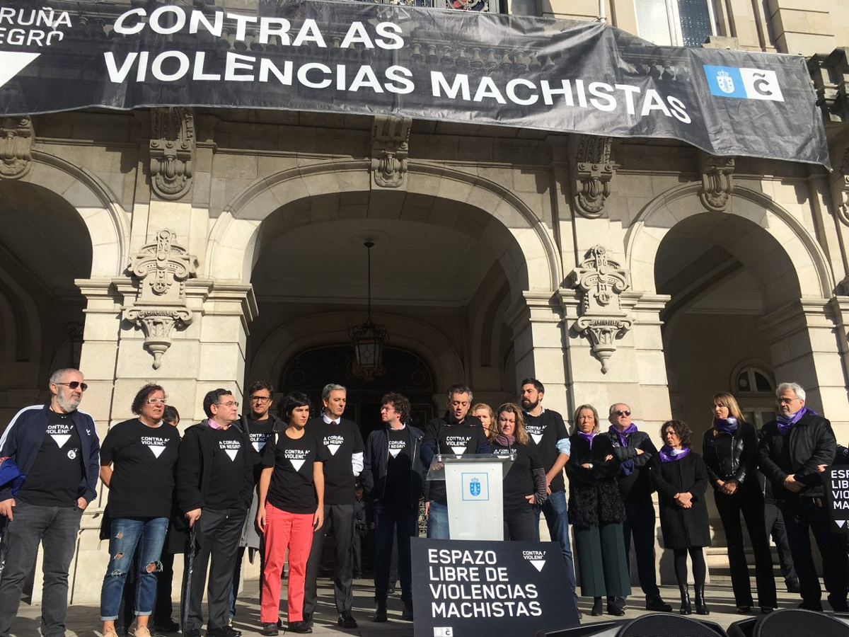 El Palacio de María Pita acogió esta mañana una concentración abierta a la ciudadanía con motivo del Día Internacional de la Eliminación de la Violencia Contra las Mujeres. La iniciativa sirvió para mostrar el rechazo vecinal a las violencias machistas, dentro de los actos de la campaña En negro contra as violencias machistas, de la que el Ayuntamiento de A Coruña forma parte, junto a otros 74 municipios y 3 diputaciones provinciales de Galicia. El alcalde, Xulio Ferreiro, fue el responsable de leer el manifiesto A Coruña en negro, en el que recordó que la violencia machista "es la más terrorífica de las desigualdades de género". "Hoy queremos manifestar nuestro compromiso como ciudad contra las violencias machistas, así como nuestro rechazo de quien ejerce las violencias y de la complicidad de quien las silencia", señaló el alcalde, quien defendió la necesidad de reconocer "las múltiples formas y manifestaciones de las violencias machistas para combatirlas". "Los asesinatos machistas, 574 en los últimos diez años según las estadísticas oficiales, son la punta del iceberg de lo que realmente están padeciendo las mujeres en situación de violencia, así como sus hijas e hijos. La lucha contra las violencias debe de ser una prioridad institucional y política, tanto en las instituciones como en todos los ámbitos que afectan a la vida de nuestras vecinas y vecinos. Debemos de rechazar todas las formas de violencia que sufren las mujeres por el mero hecho de serlo, y comprometernos, todas y todos, contra esta lucha", afirmó el alcalde. A este respecto, el primer edil coruñés abogó por reconocer la importancia del papel de las entidades locales, "las administraciones más próximas a la ciudadanía", en este ámbito. "Combatir las violencias machistas significa adoptar acuerdos y compromisos políticos para aumentar los presupuestos públicos destinados a hacerle frente, y a dotar a los equipos especializados de los recursos necesarios para su prevención y atención integral", aseveró Ferreiro.
