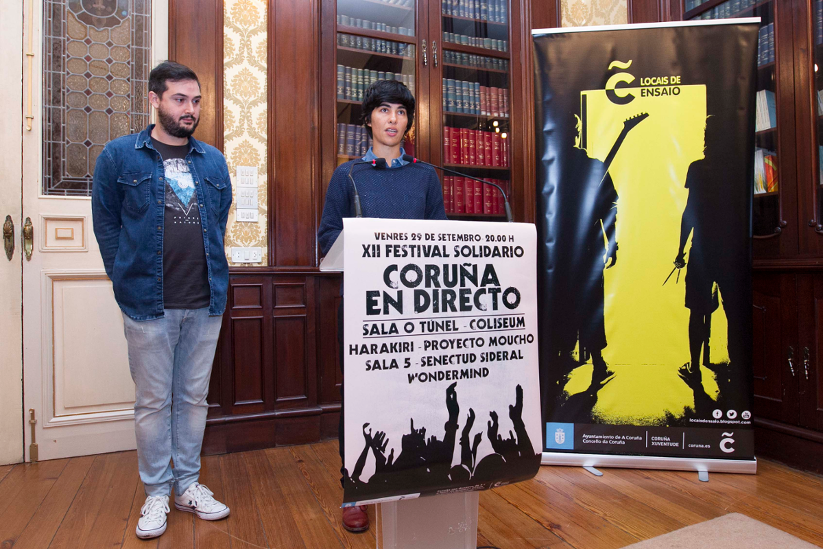 La edil Claudia Delso presentó la XII edición del Festival Solidario Coruña En Directo, que se celebrará el viernes 29 de septiembre en la Sala O Túnel y que contará con la participación de las bandas Harakiri, Proyecto Moucho, Senectur Sideral, Sala 5 y Wondermind