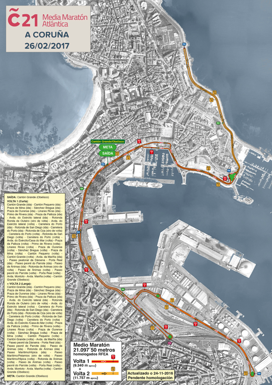 La carrera comenzará a las 10.00 horas de la mañana, en un circuito de dos vueltas --la primera de 9.340 metros y la segunda de 11.757 metros aproximadamente--. Las y los atletas saldrán del Cantón Grande hacia Linares Rivas, y pasarán por la plaza de la Palloza, avenida del Ejército, carretera do Porto y la rotonda de Oza, donde darán la vuelta hasta la rotonda de las Ánimas. Una vez lleguen allí, darán la vuelta hasta el Obelisco para iniciar la segunda vuelta, en la que harán el mismo recorrido pero que, cuando lleguen a la rotonda de las Ánimas, continuarán hasta el Paseo Marítimo - Pelamios, donde encararán los últimos tres kilómetros hasta llegar a la meta, en el Cantón Grande. El cierre de la carrera será a las 12.30 horas y, este año, además, se establecerá un tiempo de 1 hora y 15 minutos para el paso por el 10 km. --en el segundo paso por Linares Rivas, a la altura de la calle Menéndez Pelayo--. Pasado el tiempo límite correspondiente tanto al primer tramo de la carrera, así como a la distancia total, las personas participantes que sigan en carrera deberán retirarse del circuito oficial de competición.