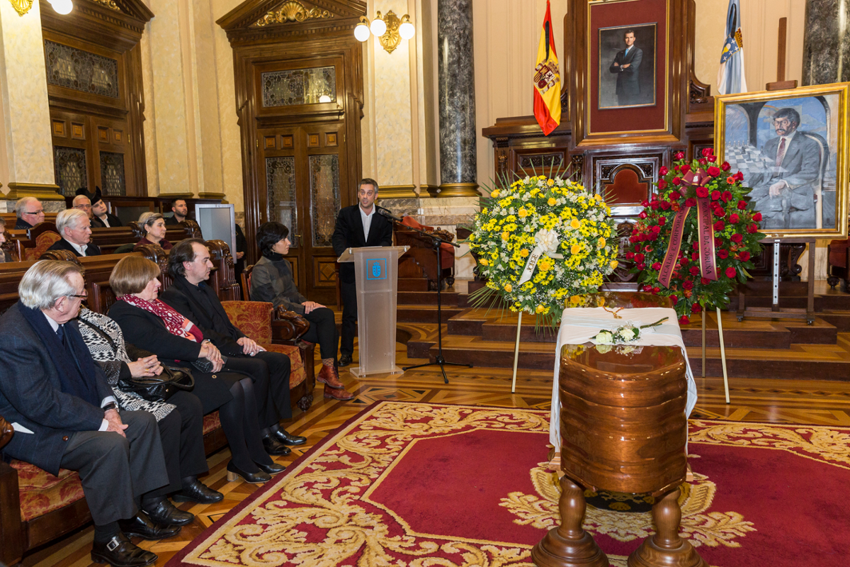 Los miembros del gobierno local y representantes del resto de la corporación local y del Parlamento gallego, junto con vecinas y vecinos de la ciudad, acompañaron a la familia y personas allegadas de Merino en un acto civil que cerró las honras fúnebres en el palacio de María Pita.