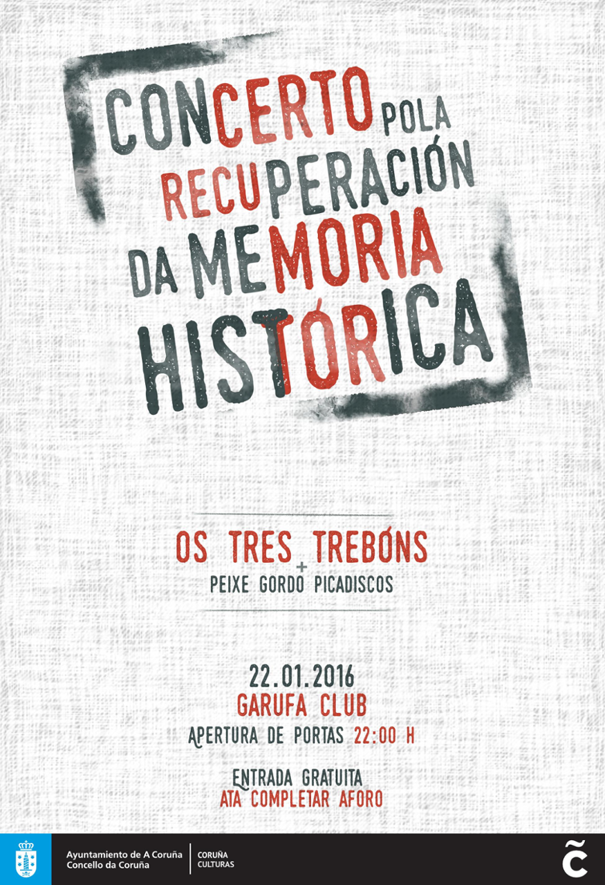 El Ayuntamiento programa para el mismo viernes el Concierto por la Recuperación de la Memoria Histórica, un espectáculo abierto a todas las personas que quieran asistir y que tendrá lugar en la sala Garufa Club, situada en la antigua calle Comandante Barja –una de las que cambia su denominación–, a partir de las 22.00 horas (apertura de puertas). Os Tres Trebóns estarán acompañados de Peixe Gordo Picadiscos.