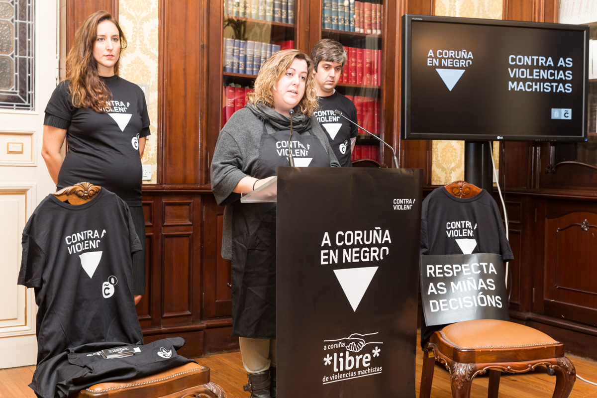 La concejala de Igualdade e Diversidade, Rocío Fraga, presentó esta mañana en el Palacio de María Pita las actividades vinculadas al 25 de noviembre, el Día contra las Violencias Machistas, y que este año se enmarcan en la campaña A Coruña en negro contra las violencias machistas, una iniciativa que se desarrollará desde hoy y hasta el próximo lunes 28 en 17 ayuntamientos de Galicia, que ayer se adhirieron en el Palacio de Raxoi a la propuesta. "El objetivo de estos 'Ayuntamientos en Negro' es concienciar al vecindario y expandir visiblemente una imagen asumible por todas y todos los agentes sociales, y que muestre la implicación común, como no puede ser de otro modo, en repulsa de las violencias machistas", expuso Fraga. "Las efemérides son importantes para visibilizar realidades. Estas campañas ayudan a que las mujeres que acuden al CIM o a la Red de Acogida lo hagan con una actitud mucho más normalizada y no de vergüenza, lo que supone una barrera menos también para afrontar su situación", explicó Fraga.