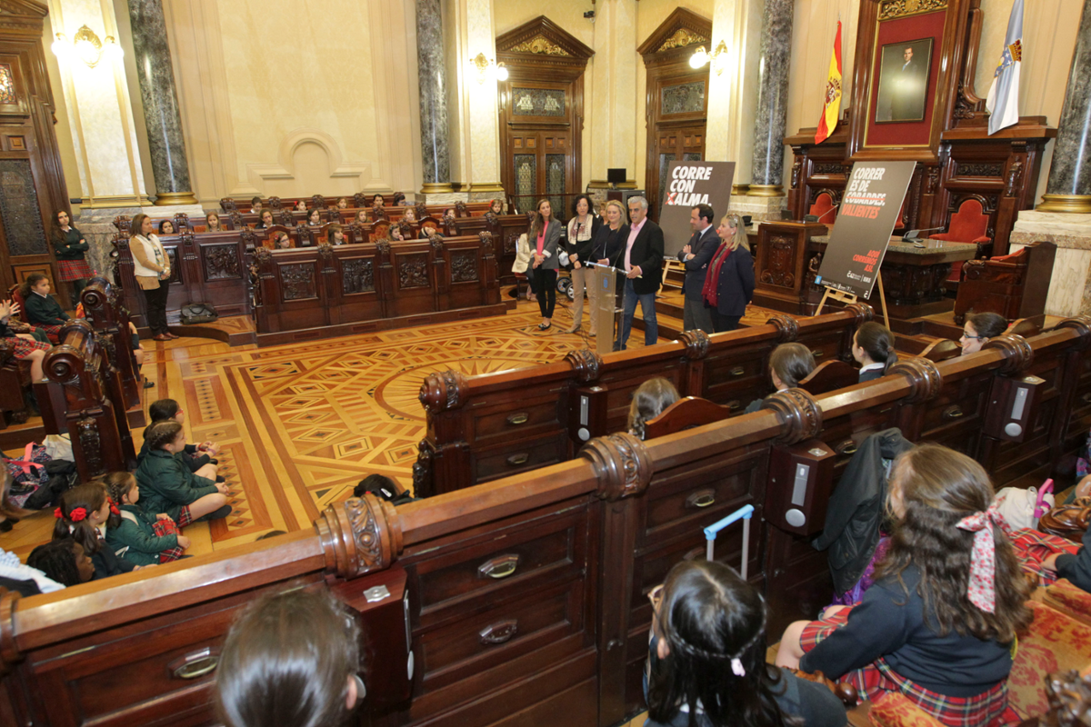 Más de 100 alumnos del Colegio Montespiño hicieron suyo el Salón de Plenos del Palacio de María Pita. Allí fueron recibidos por el concejal de Deportes Francisco Mourelo y la vicepresidenta de la Diputación Mariel Padín, quienes le entregaron su cheque de 500 € en material deportivo por ser el centro educativo con mayor número de participantes en la Mini Maratón Atlántica.