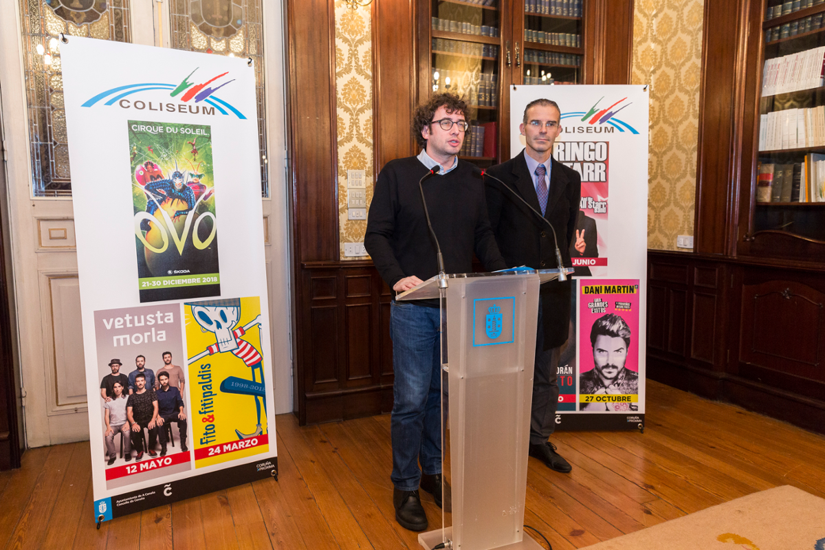 El concejal de Culturas, Deporte e Coñecemento, José Manuel Sande, avanzó este miércoles, junto con el director del Coliseum, Javier Rodríguez, las líneas principales de la programación de este recinto para el año que viene, "uno de los espacios culturales más significativos de la ciudad, tanto por su capacidad como por su condición multidisciplinar y también por su tradición", y que acogerá en el 2018 espectáculos de gran formato. De ellos, Rodríguez destacó el que ofrecerá en diciembre el Circo del Sol durante dos fines de semana, "la gran apuesta, tanto por cifras como por calidad y por el tremendo valor añadido, y que pondrá A Coruña como la única ciudad de España en la que el espectáculo Ovo esté en representación", antes de anunciar los primeros eventos musicales. En este ámbito, la agenda se abre el 24 de marzo, con Fito y Fitipaldis en su gira de 20º aniversario, un concierto que ya tiene vendidas todas las localidades a día de hoy. El 12 de mayo llegará Vetusta Morla, que ha vendido ya 4.000 entradas, casi el 50% del aforo de venta, y entre junio y julio estarán, entre otros nombres, Pablo Alborán el 22 de junio, y Ringo Star el 29 de ese mismo, que llega con un formato de 6.000 localidades, y que es, según subrayó Rodríguez, "la apuesta diferencial del Coliseum, un concierto en el que se lleva trabajando más de 14 meses y que supone una oportunidad única, como es tener un beatle en la ciudad y en Galicia". A ellos se unirá el concierto de Shakira, que llegará a la ciudad el domingo 1 de julio, tras la suspensión de su actuación este año por motivos de salud de la artista. Las entradas adquiridas para la fecha inicial serán válidas para el concierto de julio. Además, desde hoy mismo y hasta el día 17 de enero se abre el plazo para la devolución de entradas, a través de los puntos de venta oficiales donde fueron compradas. Ya en otoño, el de Dani Martín, que volverá al Coliseum el 27 de octubre. A estos eventos se sumarán, en próximas fechas, nuevos espectáculos musicales así como las propuestas dirigidas a público familiar, "lo que hace que nos planteemos como objetivos superar las 140.000 entradas vendidas y los 5 llenos absolutos", indicó el director del multiusos.