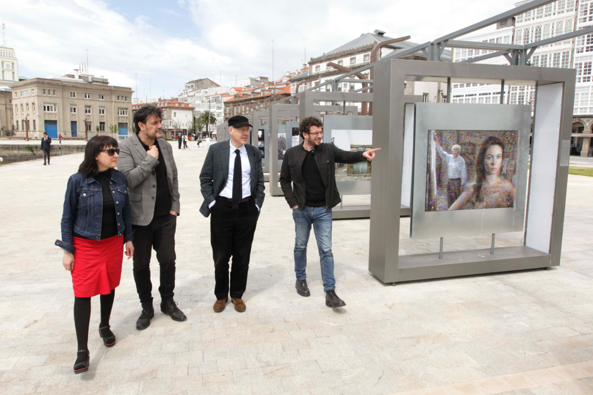 El concejal de Culturas, Deporte e Coñecemento, José Manuel Sande, inauguró en la mañana de este viernes la exposición al aire libre Platea. Los fotógrafos miran al cine, una antología de 40 trabajos de artistas estatales que ponen en relación a las artes de la imagen. La muestra, que se enmarca en la celebración de la séptima edición del (S8) Festival de Cine Periférico, se encuentra situada en la explanada de la Marina, un hecho que el responsable municipal quiso destacar durante la presesentación, "al dotar a un nuevo espacio de la ciudad de un uso artístico y cultural". "Hablamos de una nueva conquista cultural de la calle y del espacio público a través del arte y hecho creativo, de la apertura y accesibilidad a las vanguardias fuera de los recintos", señaló Sande, quien también destacó la presencia de la obra del coruñés Manuel Vilariño - Premio Nacional de Fotografía - en la exhibición y la "hermandad" que representa esta muestra entre las artes visuales, "que complementa la extensa programación del S8, en una edición que deseamos sea fructífera para todas y todos los que se acerquen a las actividades".