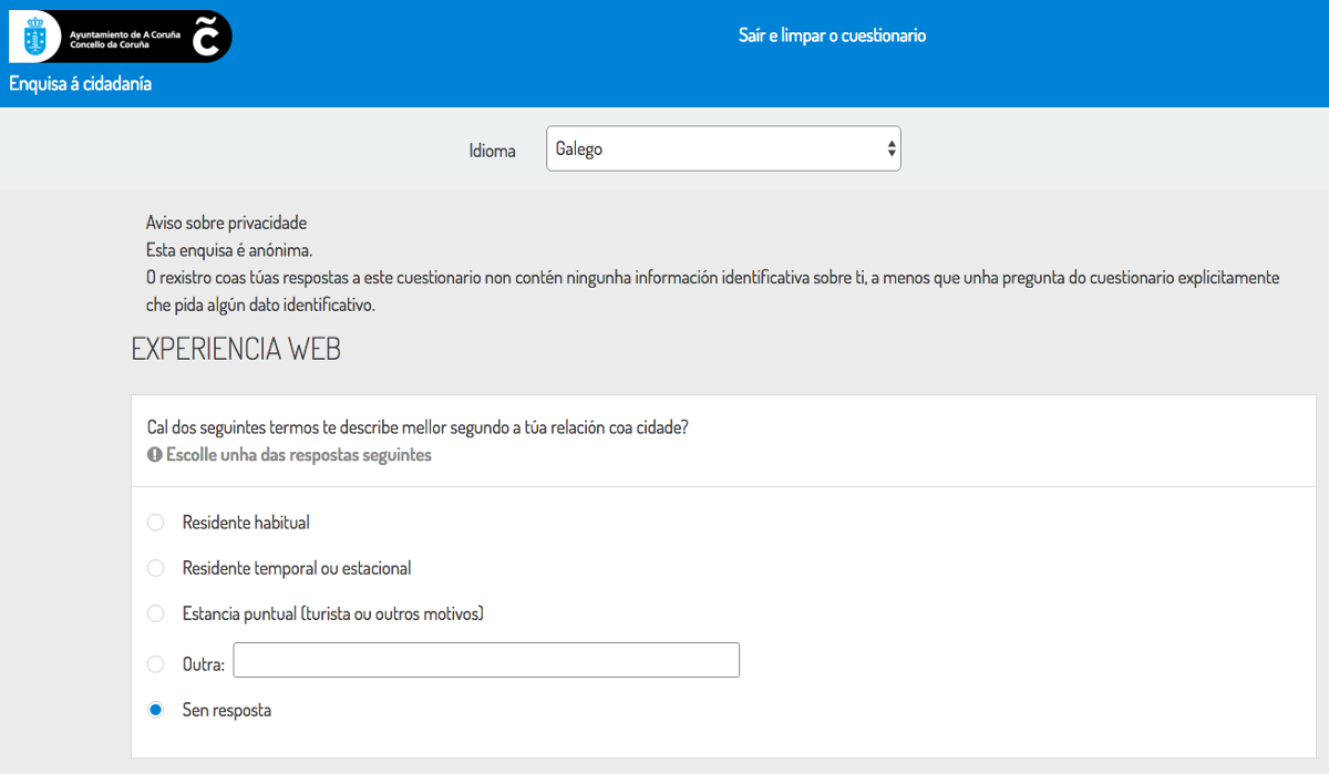 Hasta el próximo 11 de octubre, las y los visitantes del portal web municipal www.coruna.gal podrán llenar este pequeño cuestionario digital, en el que podrán aportar su impresión general sobre el portal web y el motivo de visita al mismo, así como la facilidad que presenta para encontrar la información, la calidad, los servicios y contenidos que les gustaría encontrar y cualquier otra observación u opinión que quieran realizar sobre esta página. En las próximas semanas se habilitará también la posibilidad de que las y los visitantes del portal web puedan aportar su opinión sobre cada uno de los contenidos concretos de la plataforma, e indicar si consideran que presenta algún defecto o que no responde a las necesidades informativas de la ciudadanía. "A partir de este feedback sobre cada contenido, las unidades administrativas responsables de su publicación trabajarán con el objetivo de mejorarla", señaló Delso. Además, durante este mes de septiembre, se realizará una selección de personas usuarias representativas de distintos colectivos, grupos de edad o actividad profesional con el objeto de analizar cómo se comportan en el uso del portal web y las dificultades que encuentran en su uso, para buscar nuevas líneas de trabajo para mejorar la usabilidad de www.coruna.gal