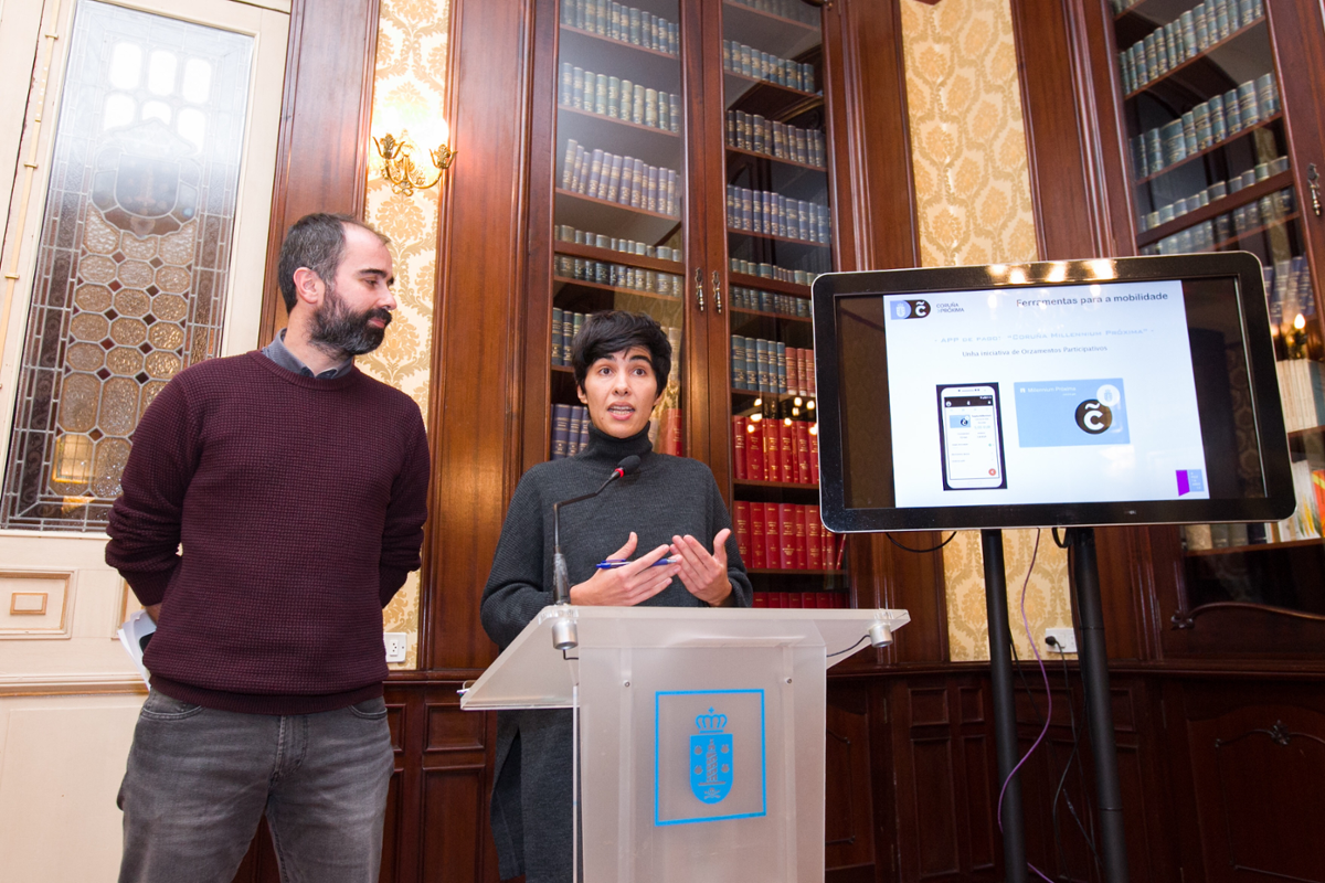 Claudia Delso y Daniel Díaz Grandío dieron a conocer la aplicación, que nace fruto de dos propuestas ganadoras de los Presupuestos Participativos. El servicio iniciará este mes de diciembre la fase de pruebas y estará disponible para el vecindario a partir de marzo