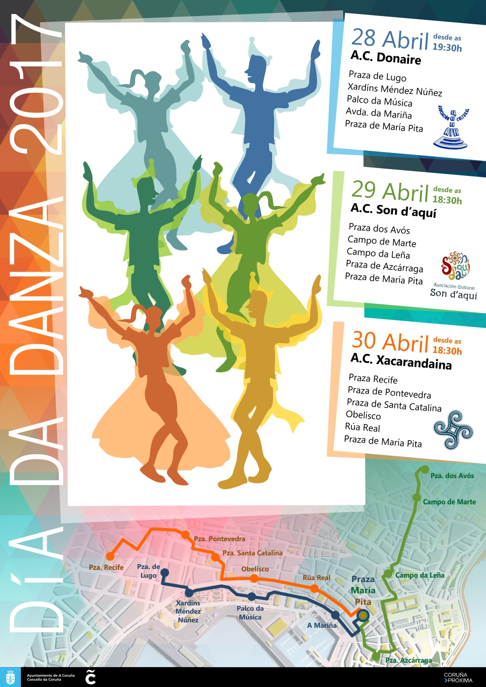 Así, durante tres jornadas, estas tres agrupaciones realizarán distintas intervenciones a través de pasacalles, ofreciendo "una reinterpretación, en clave creativa, del espacio público como lugar de convivencia para la ciudadanía y los usos culturales", afirmó Sande. De este modo, el viernes 28 de abril, y desde las 19.30 horas, la Asociación Cultural Donaire iniciará la programación municipal del Día de la Danza 2017 con un recorrido que partirá de la plaza de Lugo, para continuar por los jardines de Méndez Núñez y la avenida de la Marina hasta llegar a María Pita.