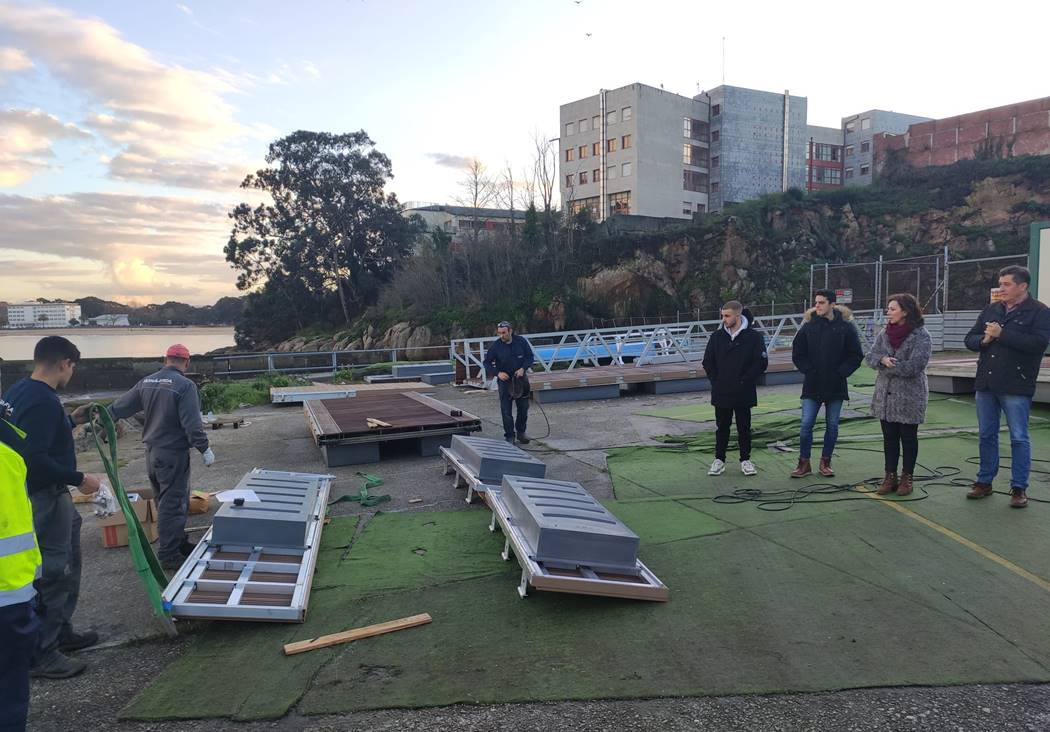 El concejal de Deportes, Juan Ignacio Borrego, acompañó a la junta directiva del club S. D. As Xubias en el inicio de los trabajos de montaje del pantalán en las instalaciones de la base náutica municipal de Oza.
