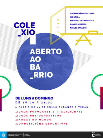 Los patios de los centros de Educación Infantil y Primaria Raquel Camacho, Juan Fernández Latorre, Alborada, Sanjurjo de Carricarte y Manuel Murguía permanecerán abiertos a partir del sábado 14 de julio, de lunes a domingo, en horario de 18:00 h a 21:00 h. En ellos, los niños y niñas podrán disfrutar de juegos populares y tradicionales, juegos pre-deportivos, danzas del mundo y competiciones deportivas.
