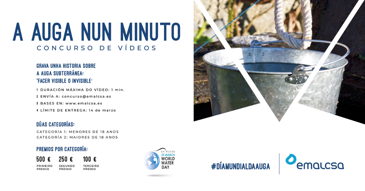 Emalcsa promueve el concurso de vídeo "A auga nun minuto" con motivo del Día Mundial del Auga 2022. La temática de este año, siguiendo el lema marcado por las Naciones Unidas será "El agua subterráneo: hacer visible el invisible". Así, habrá que enviar un vídeo de un minuto de duración como máximo sobre esta temática abordada desde cualquier perspectiva: medioambiental, higiénico-sanitaria, educativa, de ocio.