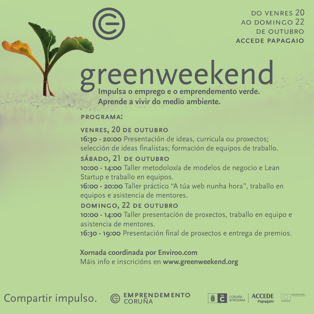 Greenweekend es una jornada impulsada por la Concejalía de Empleo y Economía Social del Ayuntamiento de A Coruña, enmarcada en el programa "Emprendemento Coruña", que se desarrollará el fin de semana del 20 al 22 de octubre y busca fomentar la economía verde y los proyectos de emprendedores ambientales.