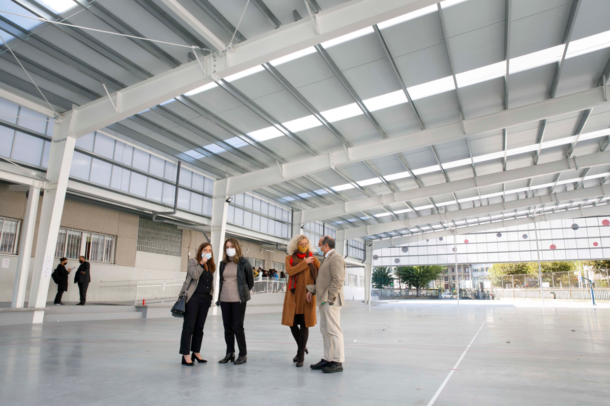 Durante moitos anos a obra da cuberta do patio estivo paralizada polos desacordos entre administracións sobre a canalización subterránea do río Monelos, que discorre polo subsolo da zona, e polos permisos derivados do paso do Camiño Inglés. Inés Rey sinalou que o concello axilizou o pasado ano a contratación desta cuberta, que permite que as e os escolares realicen axeitadamente a práctica deportiva e o recreo, e propón ademais un percorrido teitado accesible desde o colexio ata o pavillón próximo.