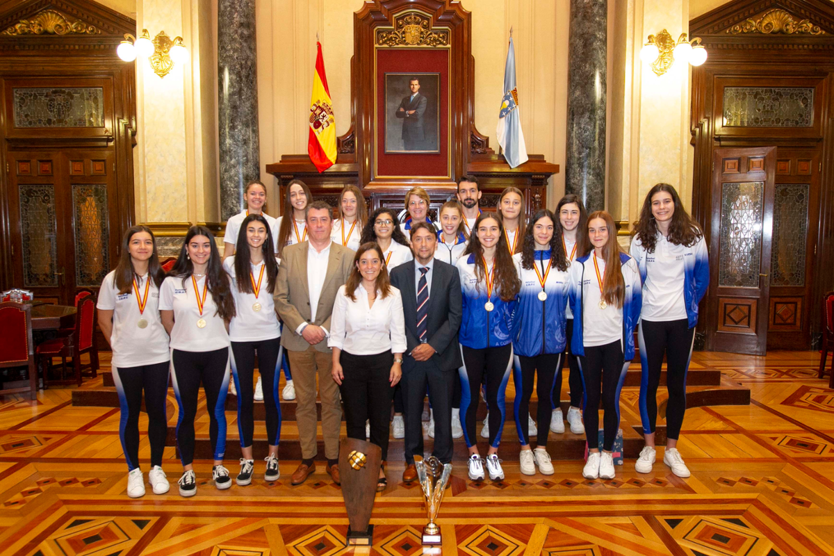 La alcaldesa de A Coruña, Inés Rey, y el edil Juan Borrego recibieron en el Palacio de María Pita al equipo cadete del Club de voleibol femenino del Calasancias, recién proclamadas campeonas de España.