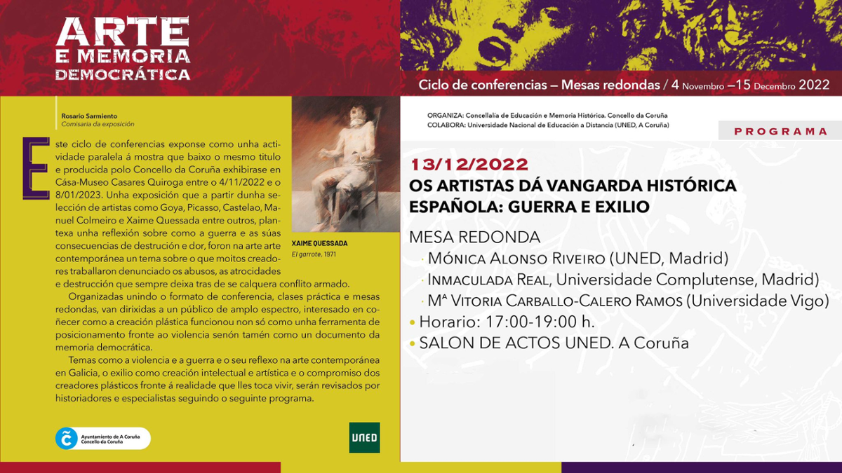 La Concejalía de Educación y Memoria Histórica del ayuntamiento organiza la segunda mesa redonda del ciclo "Arte e Memoria Democrática": Los artistas de la vanguardia histórica española: guerra y exilio.