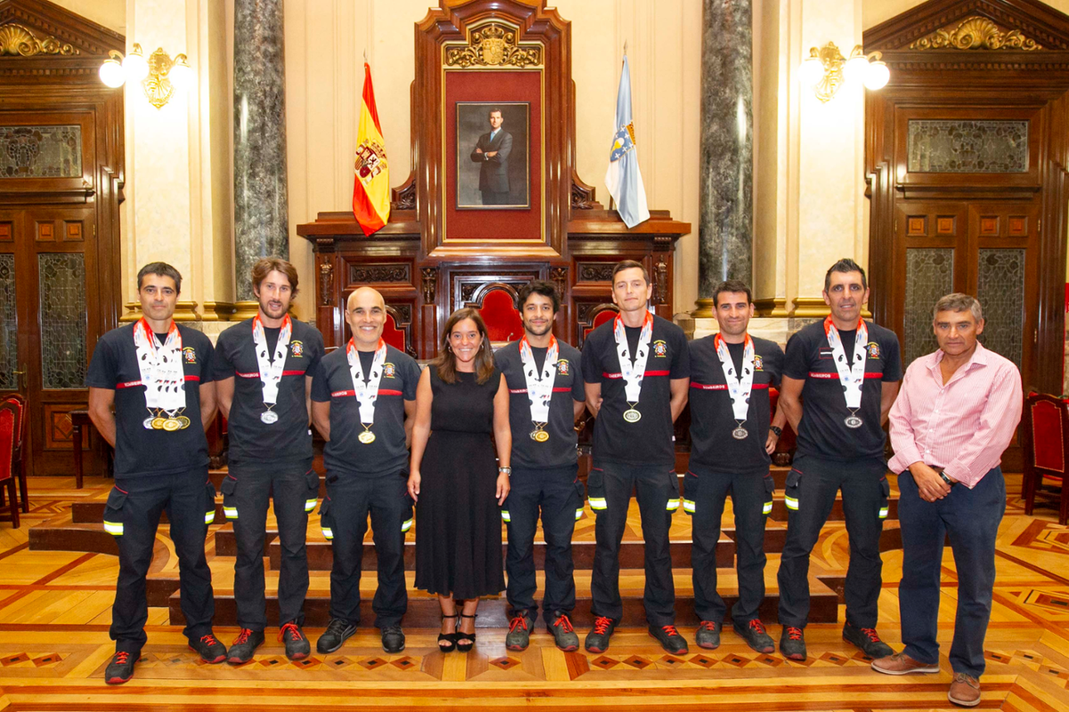 La alcaldesa, Inés Rey, recibió hoy en María Pita al equipo de bomberos de la ciudad que regresó de las Olimpiadas de Bomberos y Policías que se celebraron en Chengdu, en China, y que consiguió 11 medallas.